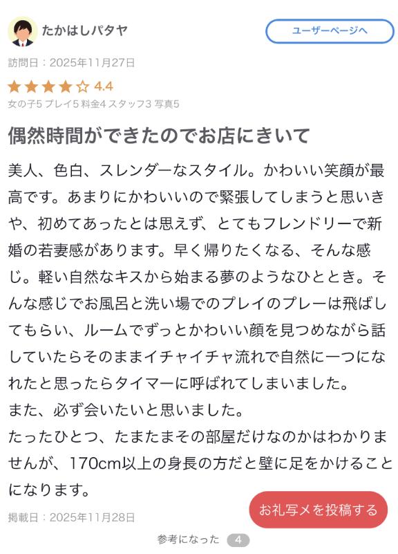 服を脱げば目を引くスレンダーボディーに透明感のある白い柔肌!余計な言葉はいらず、セクシーな眼差しにただただ見つめられただけで吸い寄せられそうなゾクゾク感。よく話しやすいと言われる性格、ホスピタリティも抜群にいい女性です。一緒に寄り添ってくれる彼女は疲れたあなたを癒してくれる・・・・・。そんな女性です☆聞き上手・床上手なので自然と普段のストレスが緩和。頭の中がスーッと真っ白に・・・至極の時間を味わえる事でしょう♡肝心なプレイの方も濃厚で病みつきになること間違いなしです。見た目でもプレイでも楽しませてくれる類まれな逸材がここに見参!!